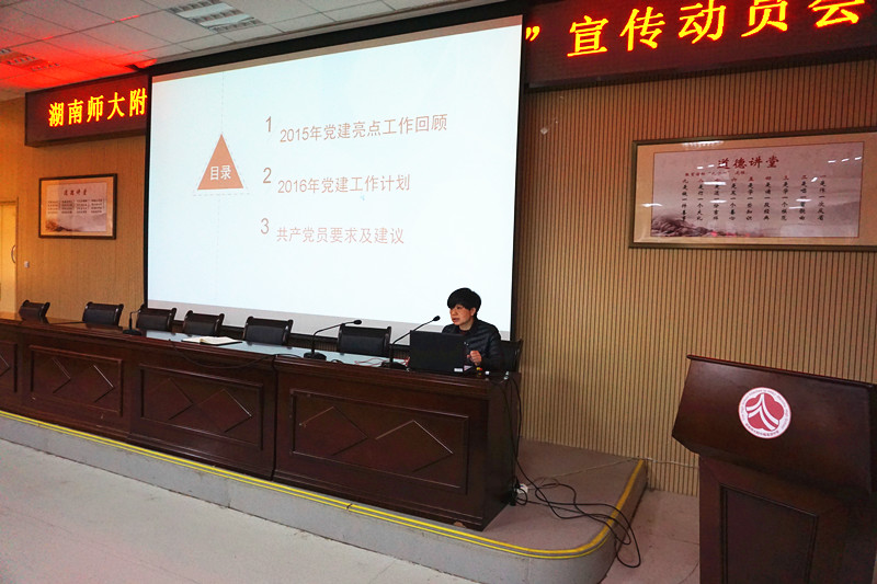 钟慧莉首先回顾了2015年我校党建工作亮点,从党组织建设、党员创先争优及党风廉政建设等方面进行汇报和展示。接着,她对我校2016年党建工作计划进行了全面解读,确立了本学期党建工作的要点为:以加强党的思想建设为引领,重教育,强信念;以加强党员队伍建设为基础,重培养,强素质;以加强纪检监察工作为抓手,重预防,强作风;以围绕教育教学工作为根本,重细节,强落实;以加强群团建设工作为保障,重规范,强和谐;以加强文明创建工作为依托,重常态,强长效;以三严三实专题教育为契机,重反思,强整改;以培植校园党员文化为目标,重宣传,强示范等八个方面。最后,钟慧莉对全体党员提出新的要求及建议,要求大家做到遵规守纪上走在前列、强化服务意识上走在前列、提高工作质量上走在前列、提升精神境界上走在前列的具有表率作用的优秀党员。