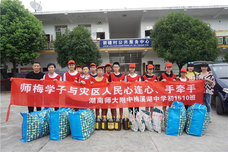 风雨同舟,守望相助,宁乡的灾情牵动着师梅师生的心。在学校的统一部署下,全校上下总动员,大家以各种不同的方式生动地诠释着“一方有难,八方支援”的传统美德。7月13日下午,八年级党支部受连点校领导、党委书记钟慧莉的委托,支部书记刘晟颖、年级工会组长周涛率年级党员老师和初1510班10余名同学及家长组成慰问小组,满载大米、食用油、棉被等救灾物资前往宁乡县的重灾区之一金洲镇南洲村开展慰问。