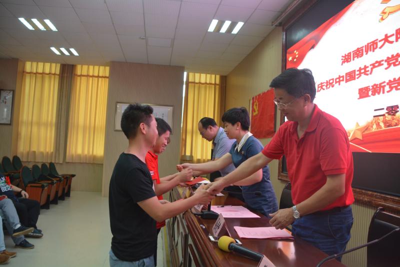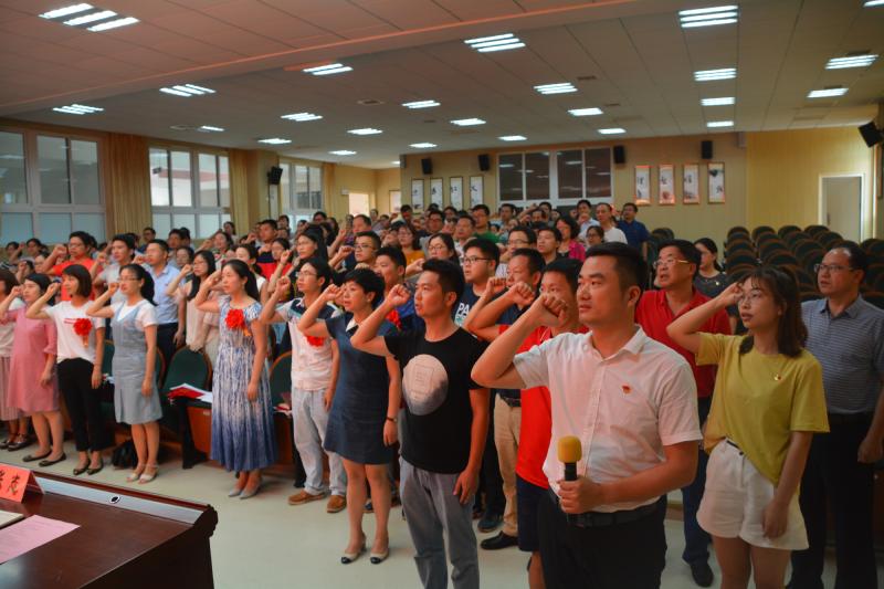 副校长胡惠宣读了《关于接收王光裕等3名同志为中共预备党员的决议》,并给新党员赠送了党章、党徽。随后,张志副校长领誓,预备党员王光裕、陈爱国、钟婷面向党旗庄严宣誓,全体党员重温入党誓词,时刻牢记神圣使命。