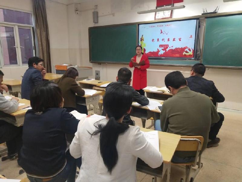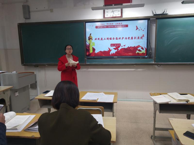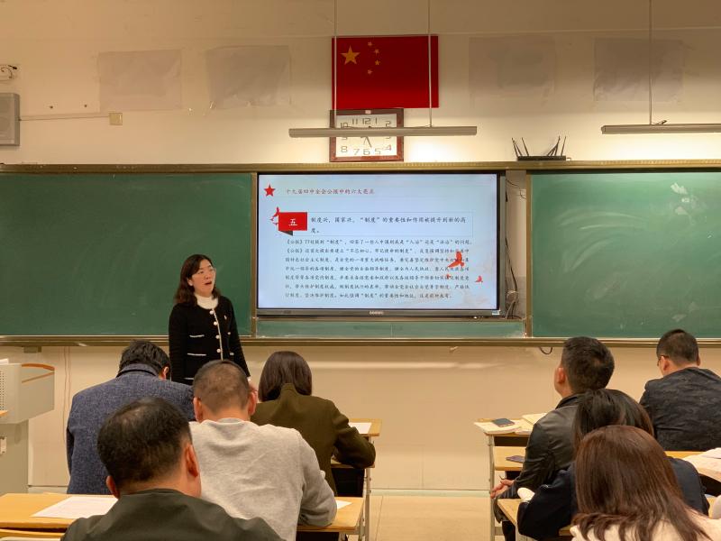 佘玉梅带领全体党员学习了前不久结束的中共十九届四中全会的精神,介绍了《关于坚持和完善中国特色社会主义制度,推进国家治理体系和治理能力现代化若干重大问题的决定》的主要内容,带领老师们系统了解了四中全会的六大亮点。