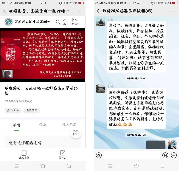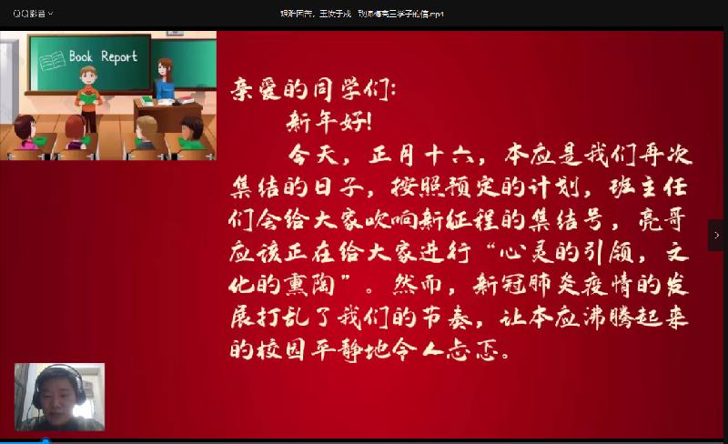 二、激励学生心志、鼓舞学生干劲。高三线上学习已经进行了20余天,由于师生无法面对面交流,部分学生出现了自律性下降的情况。高三党支部在密切关注学生身体状况的同时,也关注学生的心理状态,为了引导学生正确看待疫情,加强安全教育和逆境教育。高三支部组织委员、年级组长唐亮和纪检委员黎新波老师共同执笔了《艰难困苦,玉汝于成——致师梅高三学子的信》,经班主任、年级老师审核修改后,支部书记佘玉梅制作了课件,由唐亮主任亲自录音,在学校在线学习平台播放,至今已有2471人次收看,产生了很好的反响。很多家长和学生在看完视频后留言,表示一定抓紧时间,调整状态,积极备考。张迪平校长评价道:“文章谈古论今,纵横捭阖,弘扬了时代主旋律,充满正能量。”