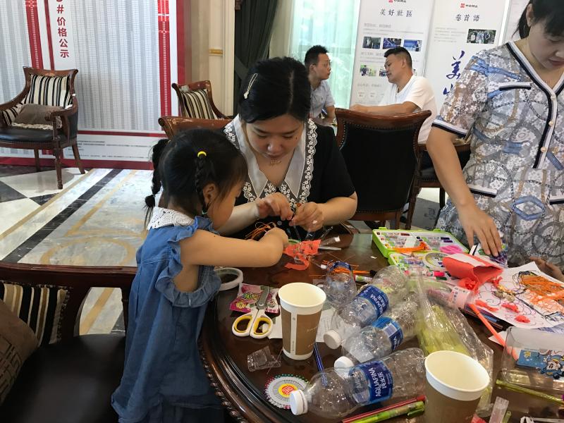 活动以废旧的塑料瓶、纸张、塑料管为原材料,在党员志愿者陈红和石晶老师的带领下,社区居民积极开展亲子手工活动。大家分桌进行,利用一些废弃材料,制作出了灵活精致的手工作品。整个制作过程中大家互相帮助,其乐无穷,大家纷纷拿着自己的作品合影留念。