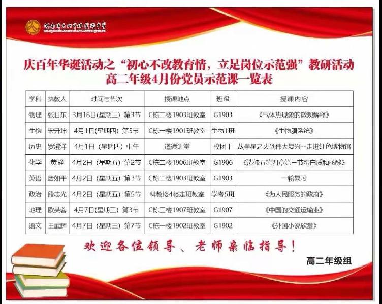 为了积极响应学校党委开展“初心不改教育情 立足岗位示范强”主题党日活动的号召,进一步发挥党员先锋模范作用,推进学校课堂改革,用优异的成绩为党的百年华诞贺礼,3月18日到4月7日,高二党支部开展了党员示范课活动。