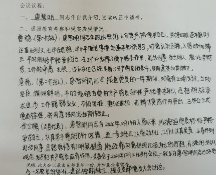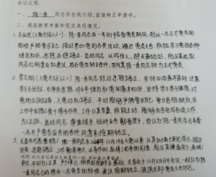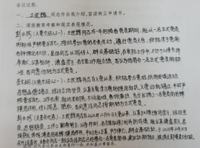 会议严格按照预备党员转正的流程要求进行,在清查人数、通报出席会议的党员情况后,陈一星、唐智明、王武辉等三位同志分别宣读了《转正申请书》,并汇报了自己在预备期间的表现。三位预备党员的入党介绍人马业武、李文纲、唐亮、曹稳、彭水珍等同志分别介绍了他们在预备期的表现,并表明同意他按期转正;与会党员同志分别对三位同志的转正发表了意见。经无记名投票表决,与会正式党员一致同意陈一星、唐智明、王武辉等同志按期转为中共正式党员。支部书记彭水珍宣读了同意三位同志按期转为中共正式党员的支部决议。王武辉同志为代表作了表态发言。
