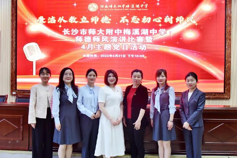为加强师德师风建设,讲好师梅人的教育故事,4月21日,学校举行了主题为“廉洁从教立师德 不忘初心树师风”的师德师风演讲比赛暨4月主题党日活动,活动由八年级党员教师薛菲主持,八年级党员牟黎黎作为参赛选手参加了此次比赛,八年级全体党员到达现场观摩学习。