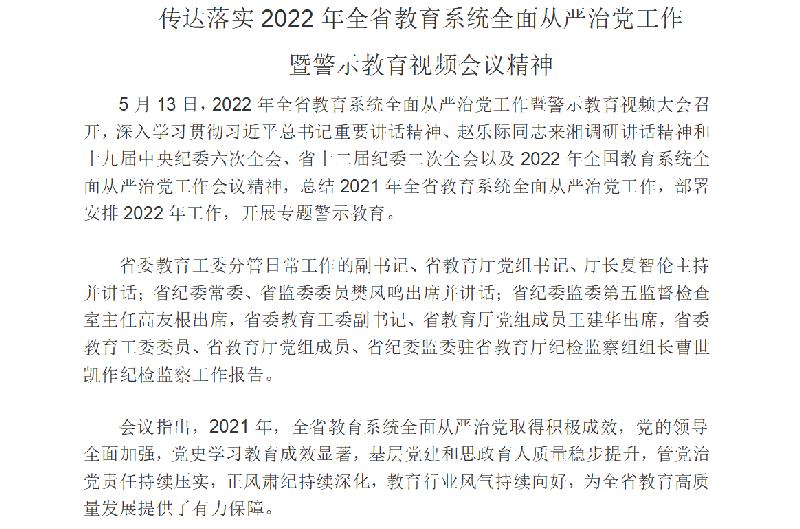 5月13日,2022年全省教育系统全面从严治党工作暨警示教育视频大会召开,深入学习贯彻习近平总书记重要讲话精神、赵乐际同志来湘调研讲话精神和十九届中央纪委六次全会、省十二届纪委二次全会以及2022年全国教育系统全面从严治党工作会议精神,总结2021年全省教育系统全面从严治党工作,部署安排2022年工作,开展专题警示教育。
