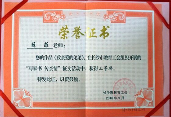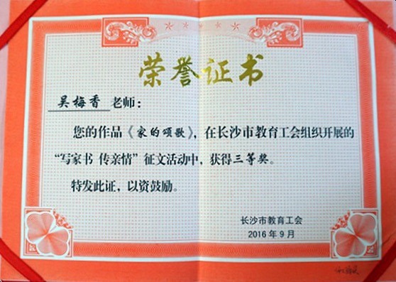 喜报:我校吴梅香、薛菲老师荣获长沙市教育工会征文三等奖 来源:工会 发布时间:2016-10-10 18:20:15 浏览次数: 次 【字体:小 大】 根据长沙市教育工会2016年度《关于长沙市“写家书、传亲情”征文活动的通报》获悉,我校吴梅香老师的作品《家的颂歌》、薛菲老师的作品《致亲爱的弟弟》荣获三等奖,特向全体师生报喜! 分享到: 【打印正文】