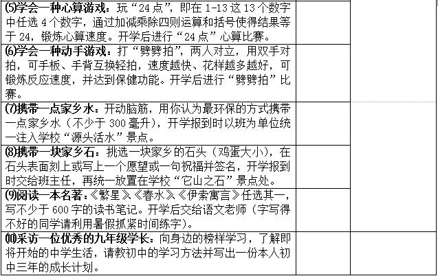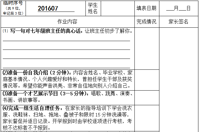 2016级初中新生暑假“十个一”实践作业完成情况记载表 来源:校办 发布时间:2016-07-25 10:10:24 浏览次数: 次 【字体:小 大】 聚彩彩票初中2016级新生 暑假“十个一”实践作业完成情况记载表 注:1.“完成情况”栏请家长根据学生完成的真实情况选择“A、B、C、D、E”等五个等级中的一个等级填入;2.本表开学报到时交班主任查验,存入学生个人成长档案袋。 2016级初中新生暑假“十个一”实践作业完成情况记载表请在附件中下载。 2016级初中新生暑假“十个一”实践作业完成情况记载表.doc 分享到: 【打印正文】