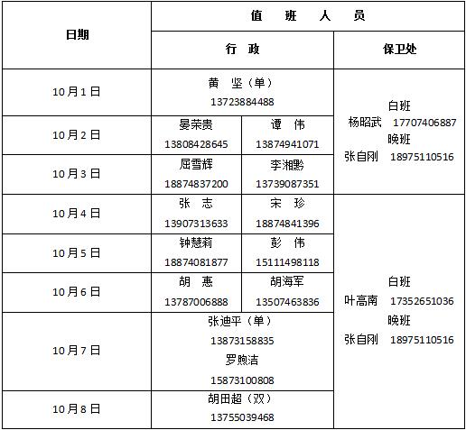 附2017年国庆节、中秋节行政、保卫值班人员安排表: