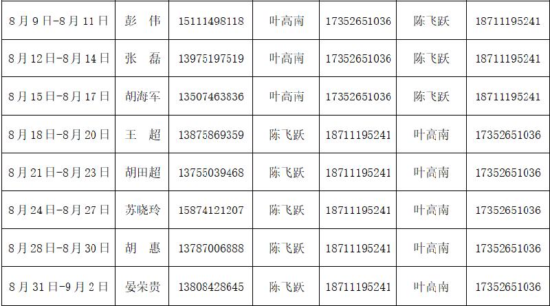 2018年暑期行政值班安排 来源:校办 发布时间:2018-07-09 17:30:27 浏览次数: 次 【字体:小 大】 2018年暑期行政值班安排 值班要求: 1.值班时间:上午八点至下午六点。 2.全天保持手机畅通,有人来校检查请立即向书记或者校长汇报。 3.熟悉文明创建迎国检工作实地考察的内容。 4.每天要有值班巡查情况记录,有问题请及时反馈至微信群。 门卫值班室电话:正门 89673019 东门89673021 负责人:李定根经理134******9359 分享到: 【打印正文】