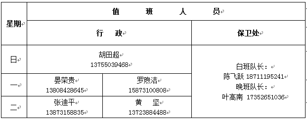 ⑴行政值班在各自办公室;⑵保卫人员在校门卫值班室(门卫值班电话:正门 89673019 东门89673021)。
