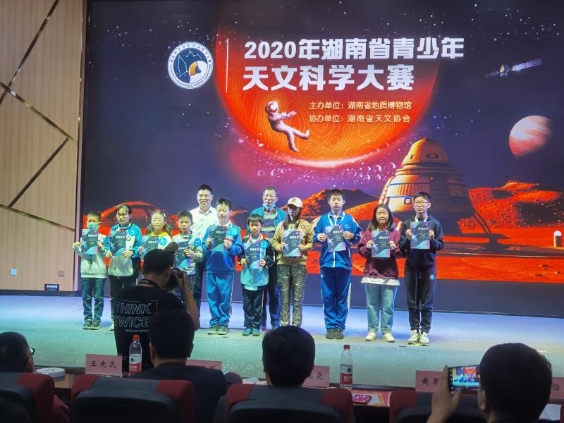 近日,由湖南省地质博物馆主办,湖南省天文协会协办的“2020年湖南省青少年天文科学大赛决赛”圆满结束。经初选,高年级组共有16名学生入围,评委会对现场选手的天文望远镜实操能力进行严格评比,最终评选出一等奖1名、二等奖2名、三等奖4名。其中高年级组全省共7人获奖,我校占4人。我校初1808班邓宇获得高年级组比赛一等奖第一名,初2003班胡逸凡、高2010班周怡馨、初2010班曹嘉翔等同学获高年级组比赛三等奖。在此,特向全校师生报喜!