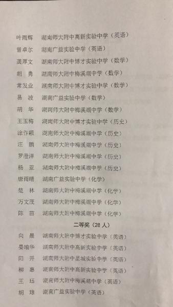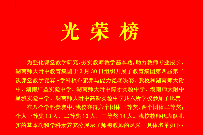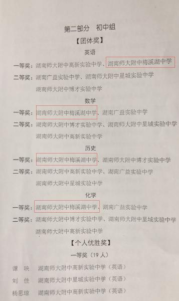 本次比赛是师大附中教育集团举办的第一届集团学科核心素养与能力竞赛。来自湖南师大附中、师大附中梅溪湖中学、广益实验中学、师大附中博才实验中学、师大附中星城实验中学、师大附中高新实验中学共六所学校参加了比赛,共166人进入决赛。在八个学科竞赛中,我校夺得六个团体一等奖,两个团体二等奖;在所有一等奖35人中,我校占据13个名额。其中,历史组老师全部获得一等奖。