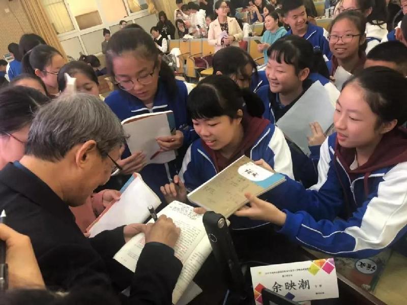 语文专场的首场是由73岁的余映潮老师带来的两堂作文示范课和一场以“关注初中作文训练的五个重点”为主题的专题讲座。3个半小时的课程,余老师全程精神抖擞,跟孩子们和老师们聊作文,不知疲惫。在场的所有人听得入迷,忘记了时间的流动,有的孩子甚至不愿意下课。对于这位语文界泰斗级的人物,大家是“百闻不如一见”,趁着下课的空隙,纷纷找余老师签名合影。