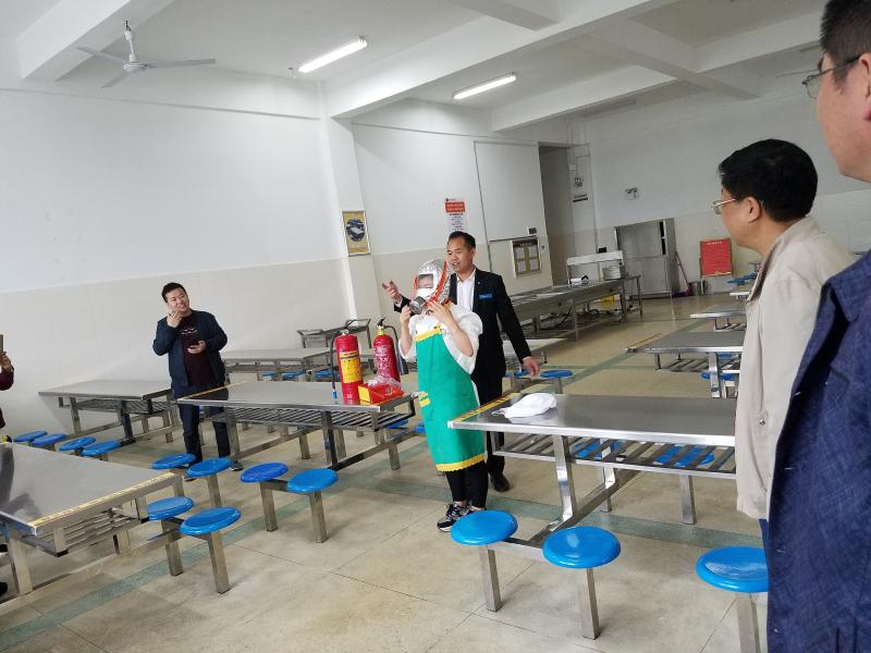 晏荣贵带领安全管理工作相关负责人对宿舍、食堂、超市、水果店、面包房、危化品仓库等处进行了深入细致的排查,并由专业消防人员、物业综合主管李定根分别对全体宿管员和全体食堂工作人员进行了干粉灭火器、自救呼吸器等消防器材的使用培训和逃生自救技能培训。