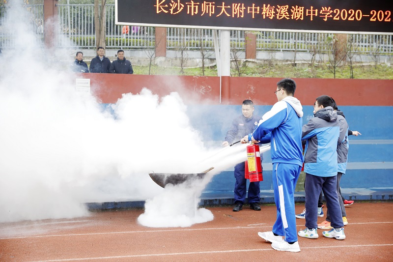 随后,岳麓消防中队的消防官兵讲解了干粉灭火器的使用方法。第一步在使用前先检查灭火器的气压,第二步检查管口有无堵塞,第三步牢记口诀:“一提二晃三拔”,最后站在上风口,对准火源根部进行喷射。师生们认真观看了现场灭火器使用演示,部分学生现场参与了灭火操作演示。