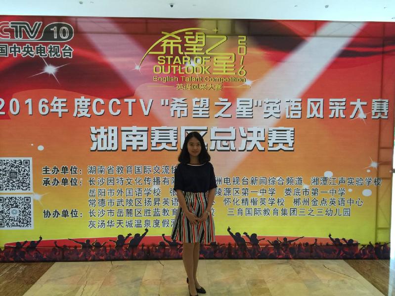 喜报:我校王珏老师荣获CCTV“希望之星”英语风采大赛湖南赛区总决赛一等奖 来源:校办 发布时间:2016-05-25 11:39:57 浏览次数: 次 【字体:小 大】 5月22日,2016年度CCTV“希望之星”英语风采大赛湖南赛区总决赛在宁乡灰汤华天城举行。我校英语组王珏老师凭借出色的表现荣获一等奖,并获得全国总决赛的预选赛资格。特此向全体师生报喜! 分享到: 【打印正文】