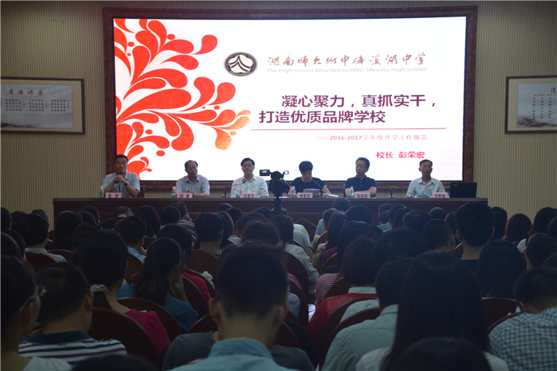 彭荣宏作了题为《凝心聚力,真抓实干,打造优质品牌学校》开学工作报告。他从学考、会考成绩,德育活动,特色项目,学生素质,师资水平,师资培训,教研成果,后勤服务,教工生活九大方面回顾了去年的工作亮点。同时,他明确了新学年的工作重点:一是加强队伍建设,打造优秀团队;二是提高教育质量,成就一流品牌;三是推进学校治理现代化。他希望,全体教职工以饱满的热情投入新学期的工作,同时,祝愿学校首届毕业生在2017年的高考中考中大获全胜,创造辉煌!