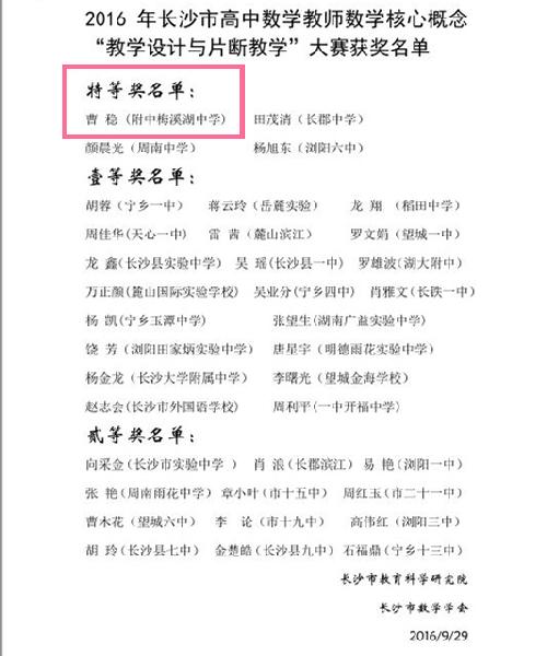喜报:曹稳老师荣获长沙市高中数学教学大赛特等奖