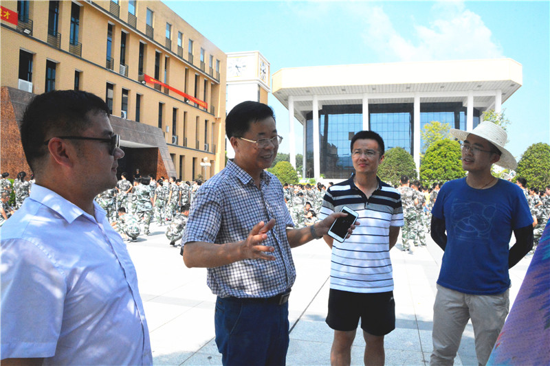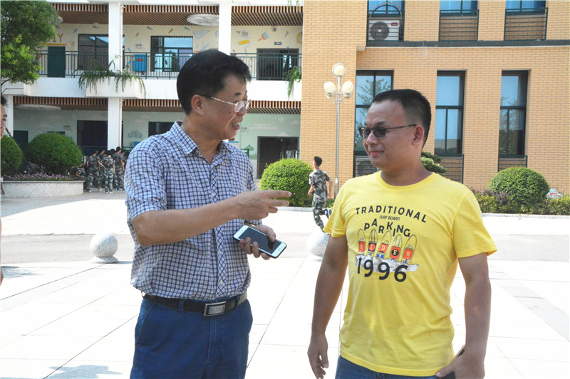 骄阳下,晏荣贵在训练场旁看着学生们做着立正、稍息、跨立、下蹲、敬礼、踏步等基本动作,很是欣慰。短短的两天,学生们的军训已经初见成效。休息期间,晏荣贵向高一年级组长方煦询问了学生的军训情况,并与同学们亲切交流,鼓励他们圆满完成军训任务。