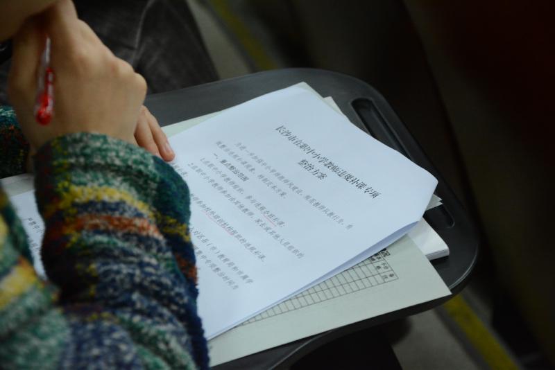 副校长张志带领全体教职员工逐字逐句学习市教育局印发《长沙市在职中小学教师违规补课专项整治方案》的文件精神,要求老师们认真听讲,并在学校的印发资料上做好笔记,提醒每一位教师认识从事违规补课的危害性及其后果,并增强杜绝违规补课的自觉性,学校纪检将采取多种方式贯彻落实文件精神;还对“八项规定”、“违规征订教辅资料”专项整治工作做了进一步的部署和要求。