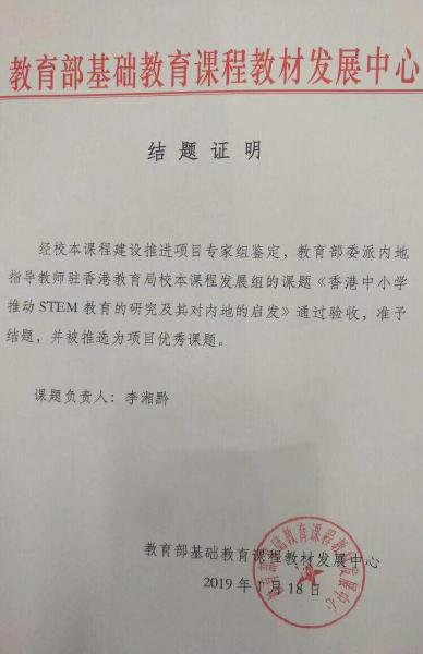 我校李湘黔老师于2016年8月受教育部选派赴香港指导教学和文化交流工作,担任教育部委派内地指导教师驻香港教育局校本课程发展组组长。在工作期间,李湘黔带领内师团队(来自全国17个省市40名专家)深度研究教育部课程中心STEM教育项目主题——香港中小学推动STEM教育的研究及其对内地的启发2019年1月18日,经教育部校本课程建设推进项目专家组鉴定,此课题经过层层遴选被推荐为教育部优秀课题。