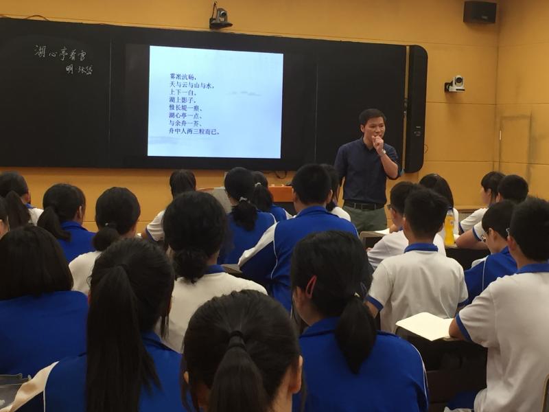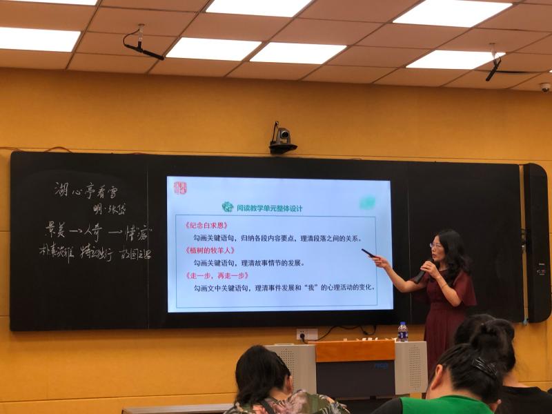 陈益副校长进行活动致辞,热烈欢迎研修班的老师来我校交流研讨。随后,我校周涛老师执教了一堂初中语文课《湖心亭看雪》。周涛以“景美、人奇、情痴”为教学主体,自主品析,合作探究,带领学生走入了张岱笔下幽静深远、洁白广阔、空灵纯粹的雪下世界。评课环节,在座教师充分肯定了周涛的教学设计与教学基本功,对这堂课给予好评。随后是教学研讨环节。在座老师首先讨论了“如何更好地为学生搭建学习支架”等问题。接着,岳麓区语文教研员、新教材研究先行者黄晓莲老师,就部编本语文教材进行了“统编教材单元主题教学”的讲座。她高屋建瓴,和在座老师讨论了教学目标、课型设计等问题,为老师们的新教材教学提供了指引。