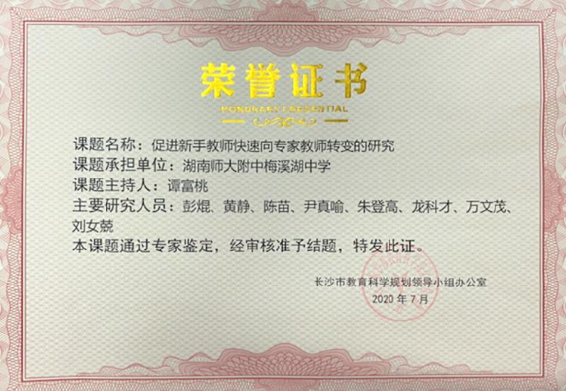 在学校领导的关心和支持下,我校市级课题《促进新手教师快速向专家教师转变的研究》成功结题。本课题由化学教师谭富桃主持,化学教研组彭焜、黄静、陈苗、尹真喻、朱登高、龙科才、万文茂、刘女兢等老师参与研究。