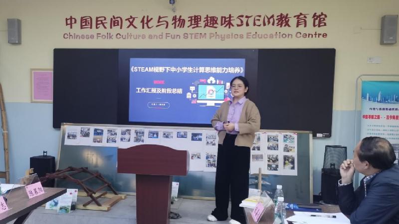 熊婧嫄以“STEM视野下中小学生计算机思维能力培养探索与实践”为主题,汇报其近段时间结合自身工作经历开展多层次符合国情、学情的教学探究;阐述《Flash形状补间动画》《Python自画像》课例展示设计思路、过程材料与目标考察;展示学生自主作品、NOIP、CSP-J/S获奖情况;规划下阶段Python语言与人工智能校本课程建设。