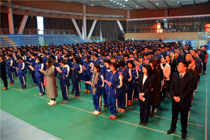 2月27日,春意盎然、阳光明媚,我校首届高三学子在体艺馆三楼隆重集会,举行了“全力以赴,奋战百日”高考百日誓师大会。参加大会的有学校全体行政人员、2017届高三师生及部分家长。大会由高三年级组长张磊主持。