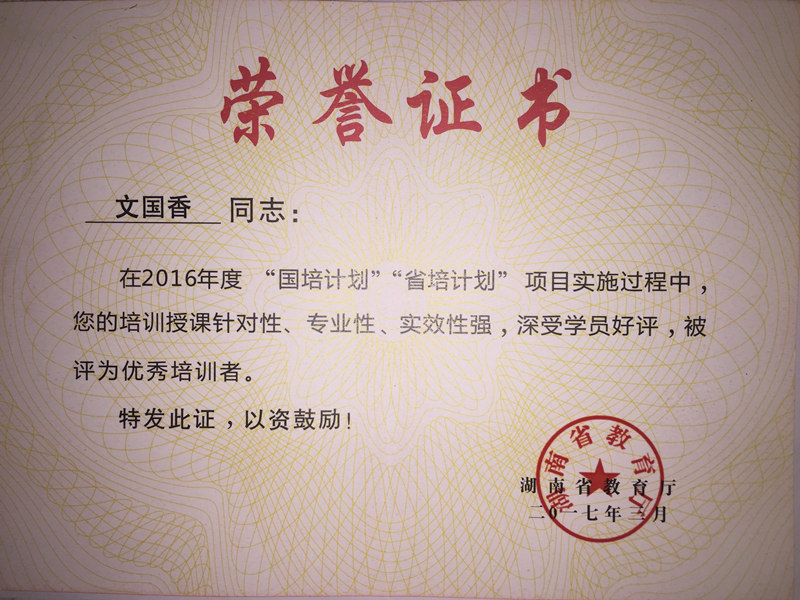 喜报:文国香老师被湖南省教育厅评为“2016国培、省培计划优秀培训者” 来源:校办 发布时间:2017-06-15 10:38:46 浏览次数: 次 【字体:小 大】 我校心理教研组文国香老师多次受邀担任“国培计划”、“省培计划”授课教师,授课针对性、专业性、实效性强,深受学员好评,被湖南省教育厅评为2016年度“国培计划”“省培计划”优秀培训者。 特向获奖教师和心理教研组表示祝贺!向全校师生报喜! 分享到: 【打印正文】