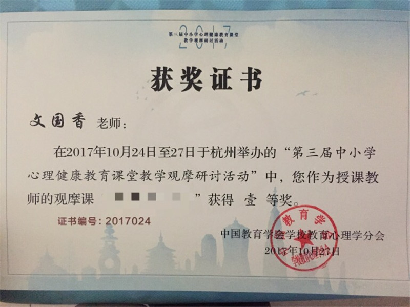 10月24日至27日,“第三届中小学心理健康教育课堂教学观摩研讨活动”在杭州举行,来自全国各省市的1300多名心理教师观摩了71堂优质的心理健康教育活动课。我校心理组教师文国香执教的《做善倾听的人》荣获一等奖。