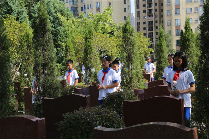 随后,所有师生向烈士默哀3分钟,并献上了洁净、淡雅的白菊,清扫了烈士墓碑,以此表达他们对烈士崇高的敬意。