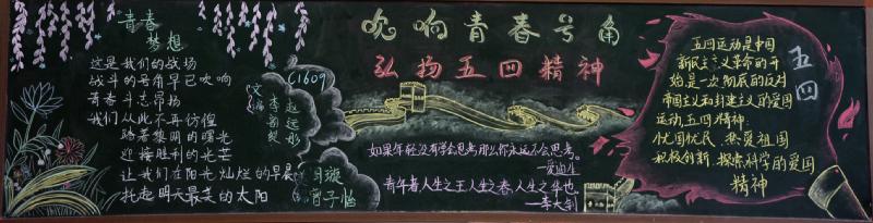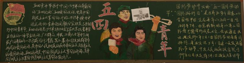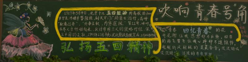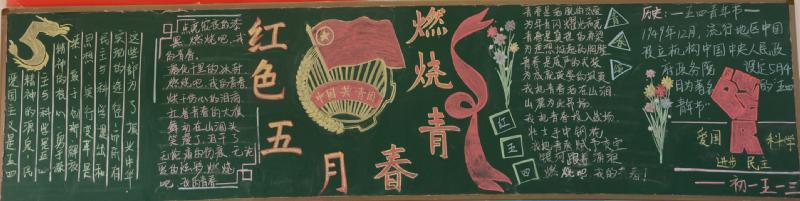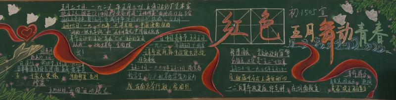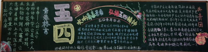 五月的春风情深意暖,五月的花海流溢飘香,和着春潮,伴着夏韵,在花海灿烂夺目的季节里,我们迎来了“五四”青年节。我校在举行了"红色五月 燃烧青春"以及"以青春的名义 弘扬五四精神"的黑板报评比活动。