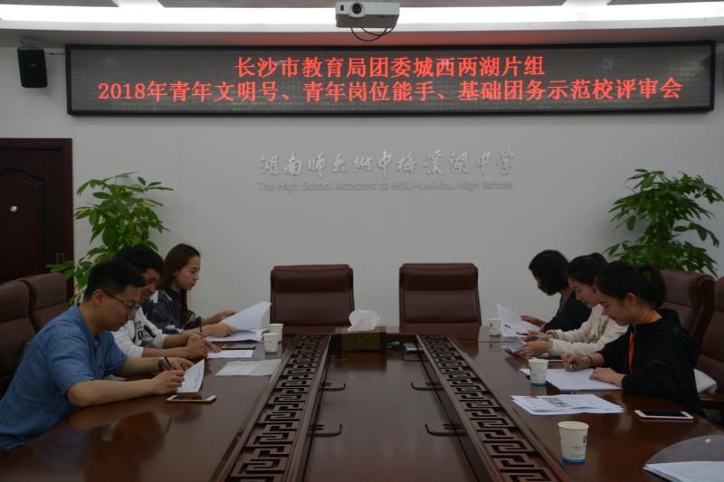 为贯彻落实长教团发〔2018〕02号、03号、04号红头文件,做好2018年度长沙市教育系统“青年文明号”创建集体申报、推选青年岗位能手、评选第二批长沙市“基础团务示范校”工作,4月11日下午,长沙市教育局团委城西两湖片组成员前往我校图书馆一会议室召开“2018年青年文明号、青年岗位能手、基础团务示范校”评审会。片组组长、长郡梅溪湖中学团委书记魏政,我校团委书记兼学工处副主任罗煦洁,特殊学校团委书记秦舒静,周南梅溪湖中学团委书记梅惠宇,雅礼洋湖实验中学少先队辅导员夏蔚怡,我校少先队辅导员郭金石参加了本次会议。会议由罗煦洁主持。