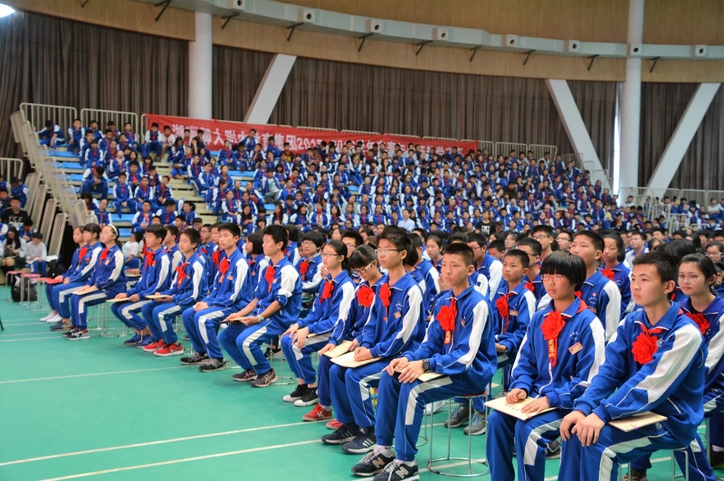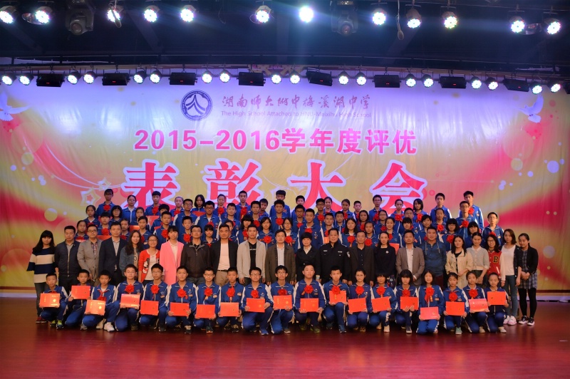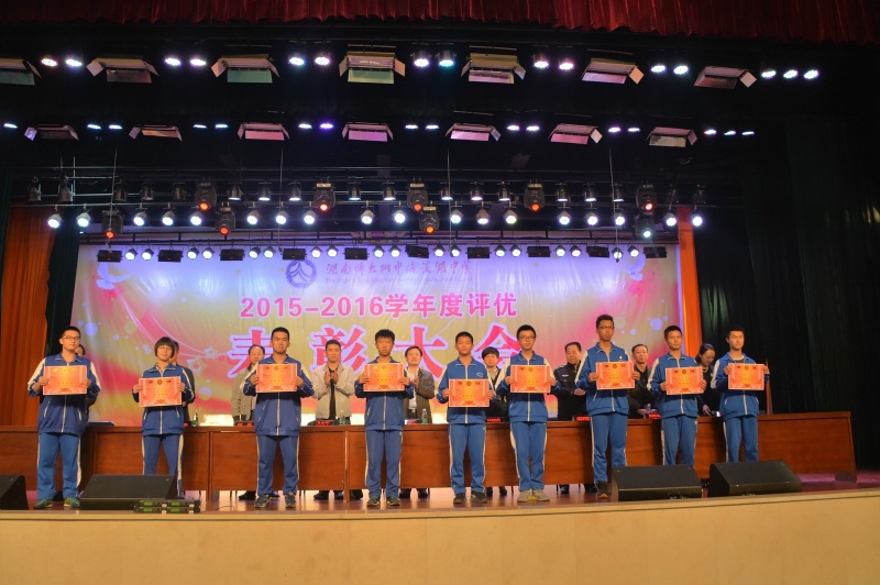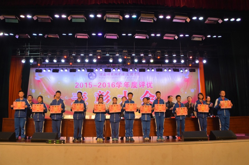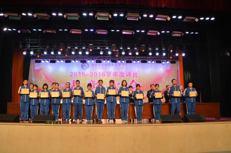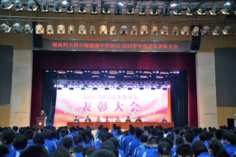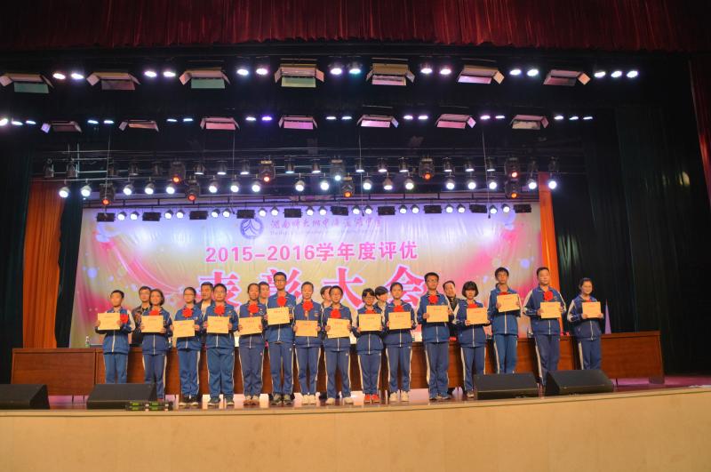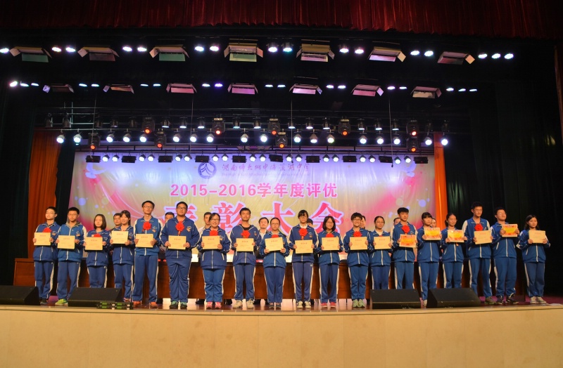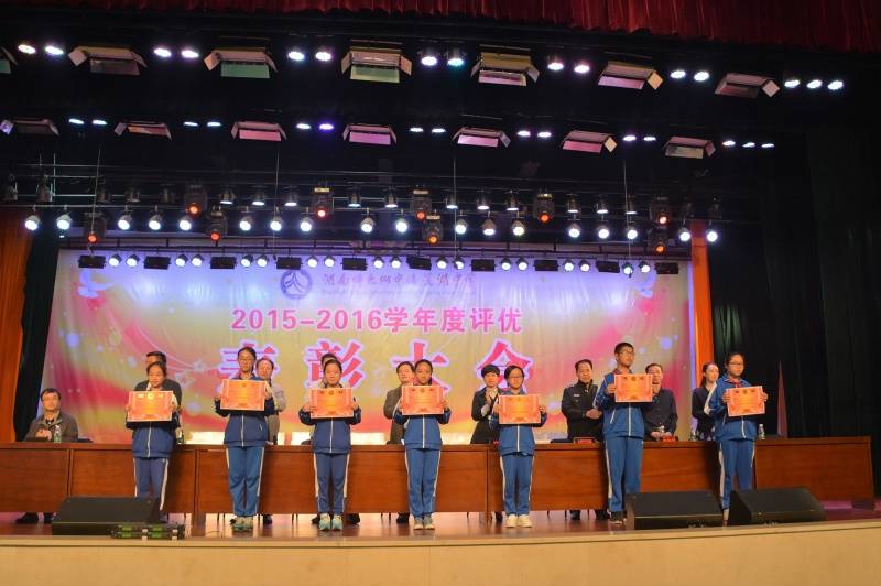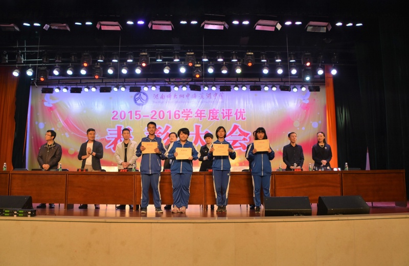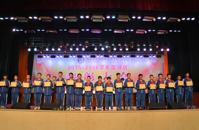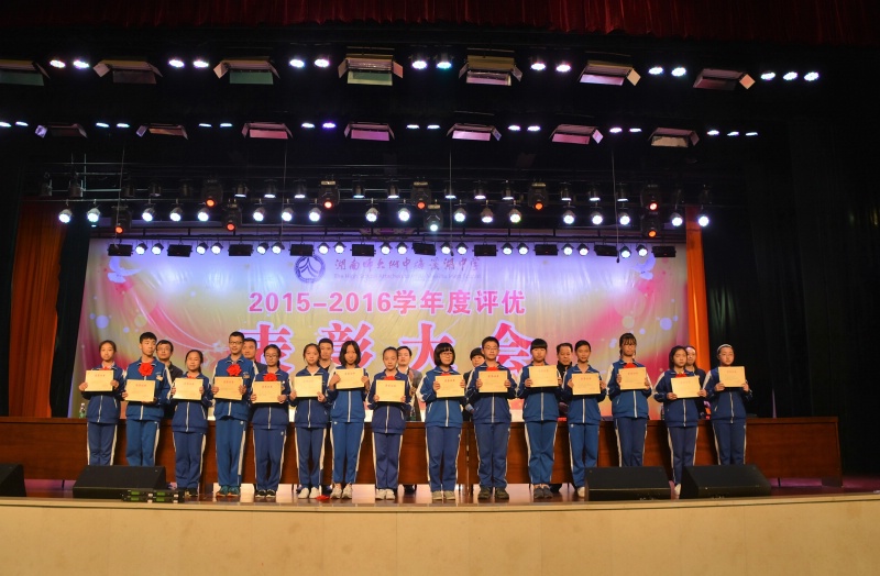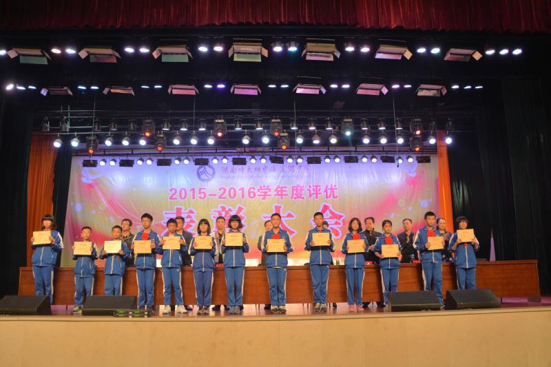 5月27日下午,学校2015-2016学年度评优表彰大会在体艺馆三楼隆重举行。校长彭荣宏,党总支书记钟慧,副校长胡惠、张迪平、张志,校长助理屈雪辉,教务处主任梁平等校领导,梅溪湖派出所副所长兼我校法制辅导员胡明智,校家长委员会主任谌灵军、副主任孙哲等嘉宾出席会议。大会由学工处副主任兼保卫处副主任胡海军主持。高一年级和七年级全体学生参加了大会。