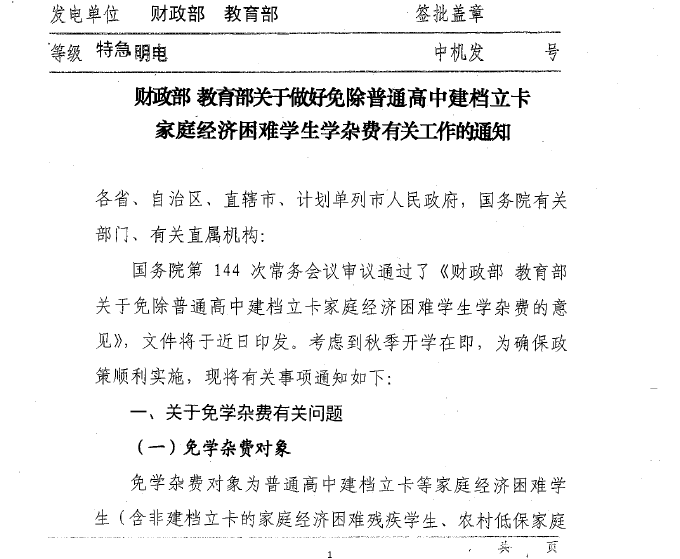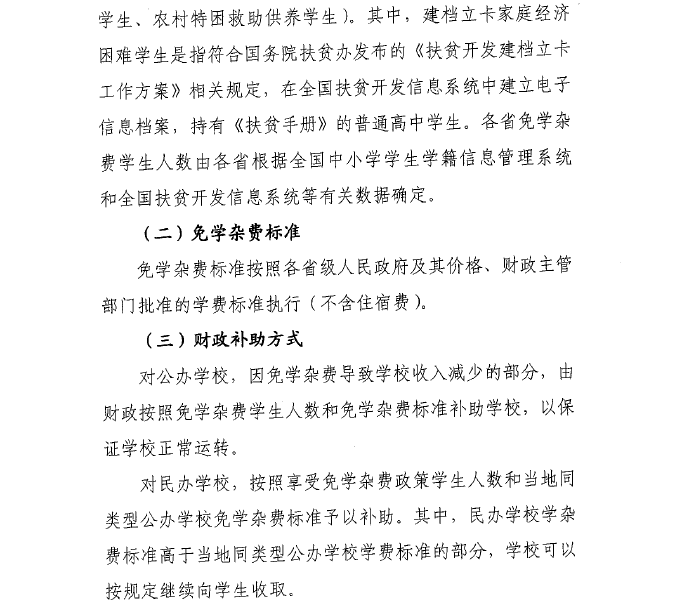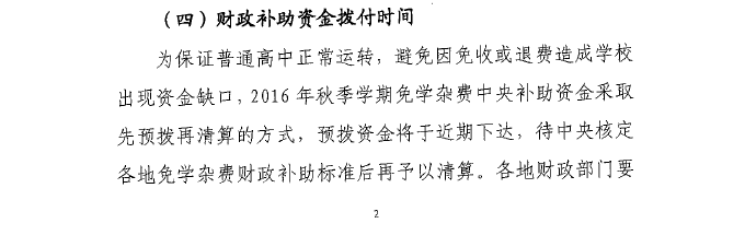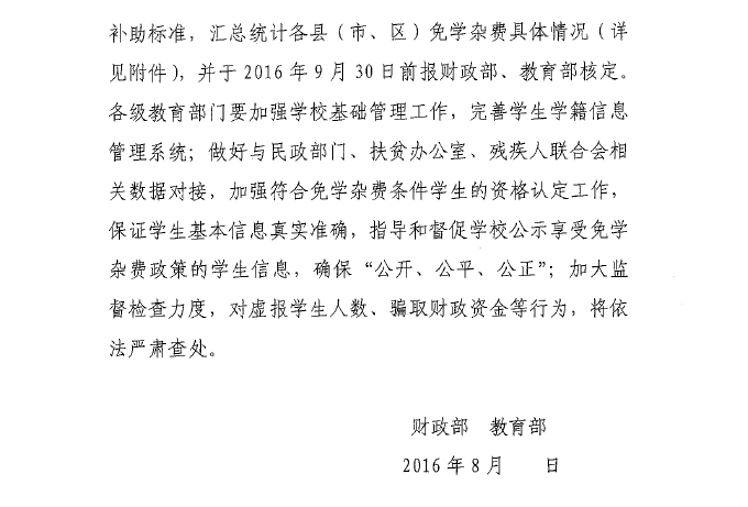 财政部 教育部关于做好免除普通高中建档立卡家庭经济困难学生学杂费有关工作通知 来源:学工处 发布时间:2016-09-13 18:08:39 浏览次数: 次 【字体:小 大】 财政部 教育部关于做好免除普通高中建档立卡家庭经济困难学生学杂费有关工作的通知.pdf 分享到: 【打印正文】