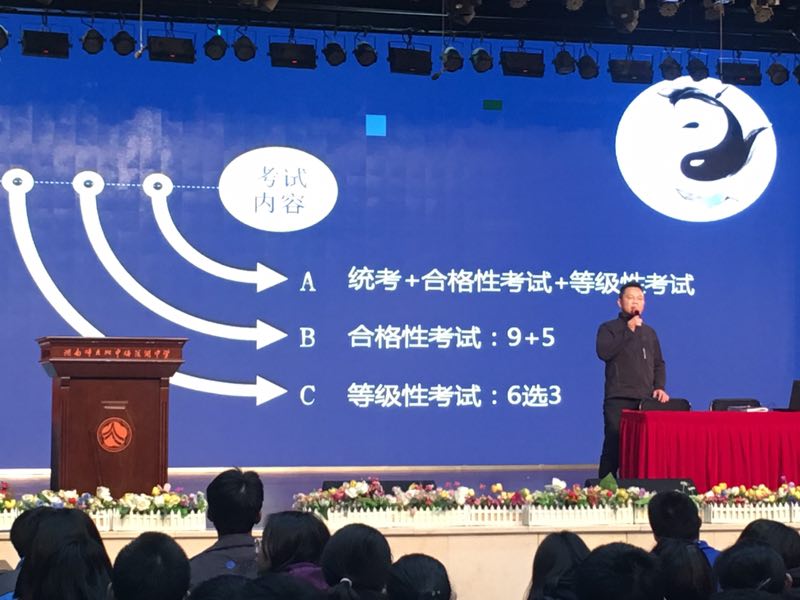 会议上,张磊用一个新颖有趣的故事引入,对浙江、上海、山东、辽宁、广东等省份的不同高考政策进行了解读。他求同存异,既对新高考的整体模式进行了全面详细的分析,又针对湖南省的新高考特点进行了大胆可信的猜想,同时还对同学们提出了有目的地学、有节奏地学、有效率地学等要求,对家长们参与新高考提出了期望!