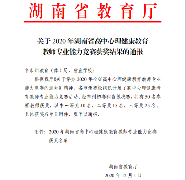 湖南省教育厅关于2020年湖南省高中心理健康教育教师专业能力竞赛获奖结果的通报.pdf