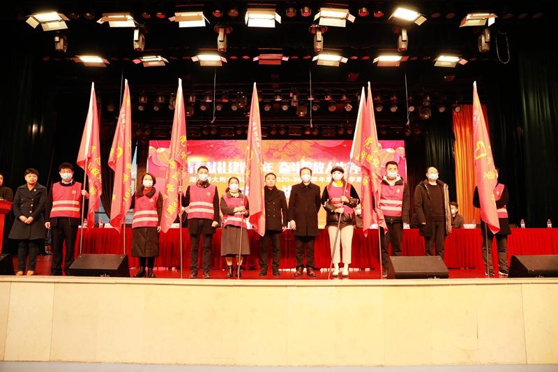 最后,党委书记钟慧莉向学校七个志愿者服务队授旗并作总结讲话。她鼓励全体师梅人个个讲奉献,真情暖人心,更加深入地践行师梅志愿服务精神,为中国共产党100年华诞献礼。