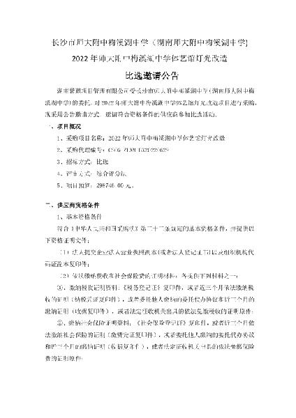 2022年师大附中梅溪湖中学体艺馆灯光改造 比选邀请公告
