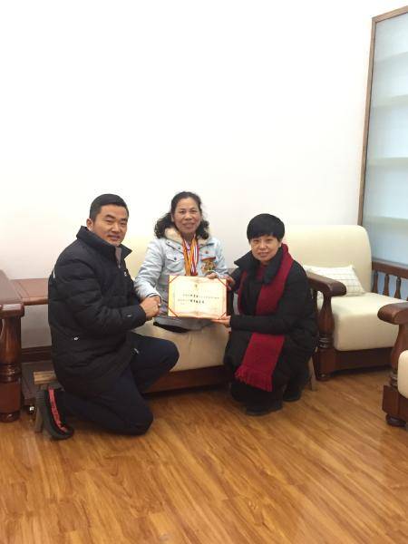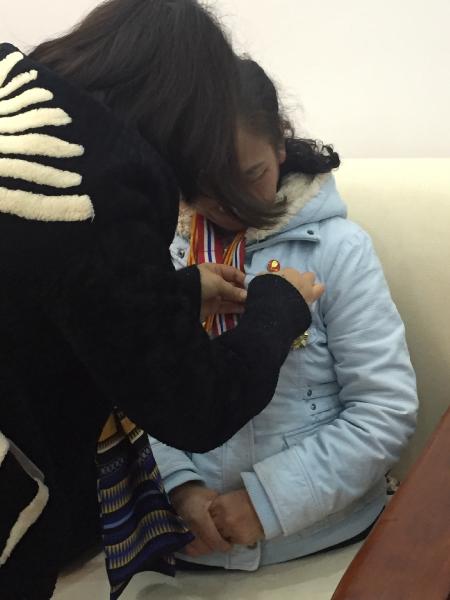 师大附中梅溪湖中学工会主席宋珍老师帮助许月华同志佩戴奖章。