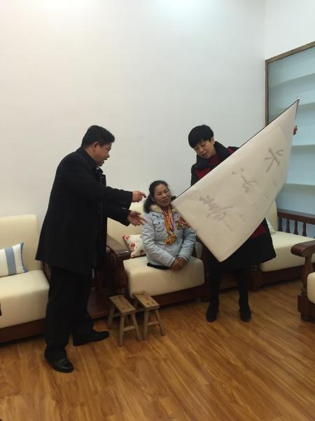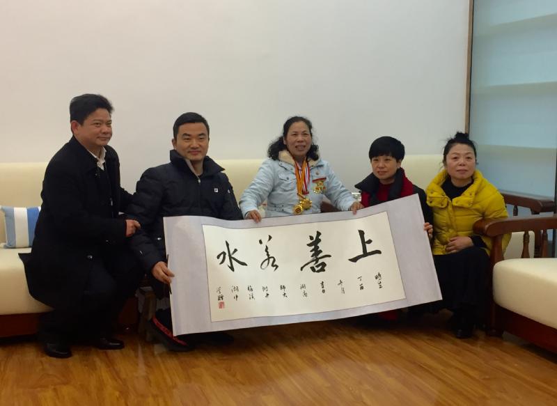 钟书记代表学校为许月华同志送上由师大附中梅溪湖中学晏荣贵校长赠字,钟书记及贺娟老师合写的书法作品"上善若水"。(老子曾说:"上善若水,水善利万物而不争,处众人之所恶,故几于道"。意思是说:最美好的品格,高尚的情操,应像水一样。水滋养万物、造福万物却与世无争;更可以处在众人厌恶的地方洁身自好,达到美好境界。而许月华的感人事迹,概括起来就是:上善若水、大爱无疆!)