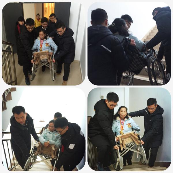 演讲结束,许月华同志从台上自己依靠板凳下台阶,老师们赶紧去帮忙,推来轮椅,但她却摇摇手,说,"我还想去看看孩子们。"