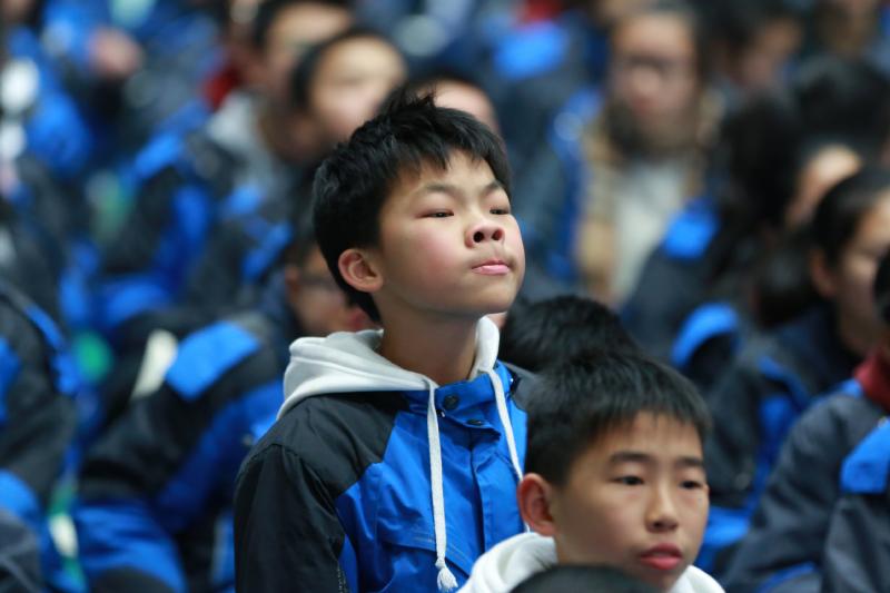 师大附中梅溪湖中学七、八年级的学生在台下端坐,认真听讲座。讲座期间,他们在笔记本上认真做记录。