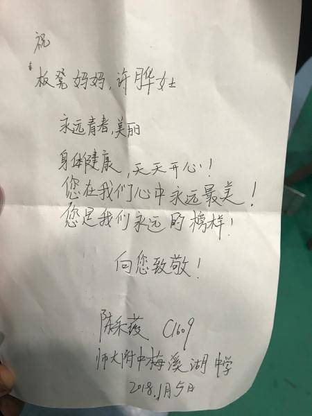 C1609陈采薇同学递给许妈妈一张纸条,写着对许妈妈的祝福,"您在我们心中永远最美,您是我们永远的榜样!"