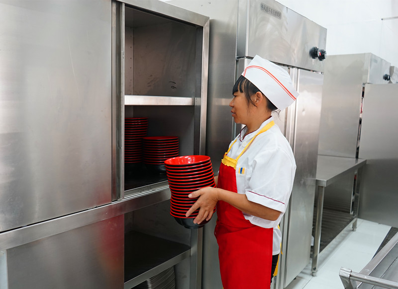 清洗消毒完毕的餐具存放进柜