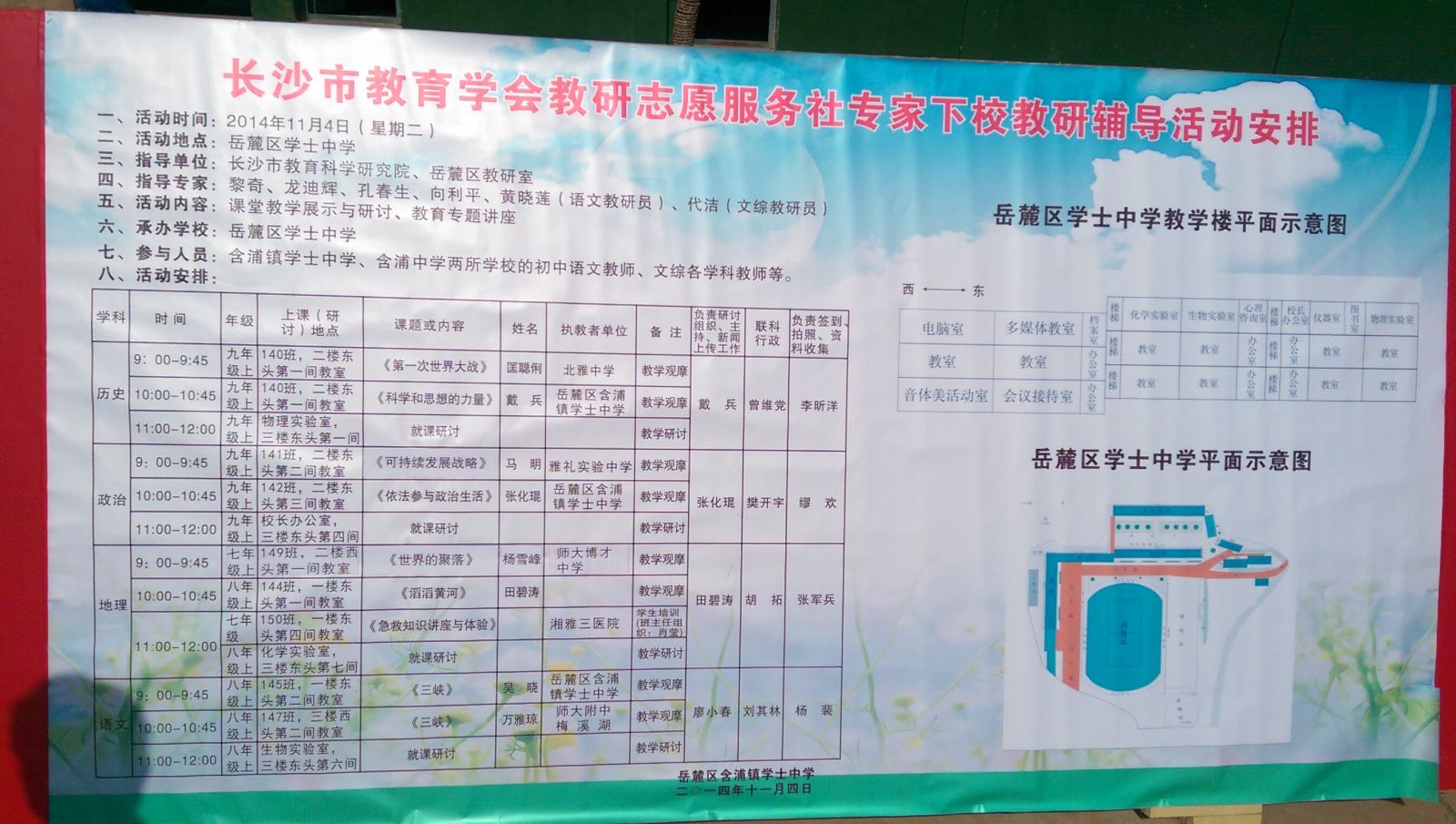 11月4日,冬日暖暖,笑声盈盈。为促进城乡教育均衡发展,长沙市教育科学研究院携手岳麓区教研室,在长沙市教育科学研究院院长黎奇、书记龙迪辉、副所长孔春生等领导的带领下,把这一次教研志愿服务社专家下校教研辅导活动的温暖,送到了含浦镇学士中学。含浦镇学士中学、含浦中学两所学校的老师和湘雅三医院志愿服务的教授和医生参加了此次活动。