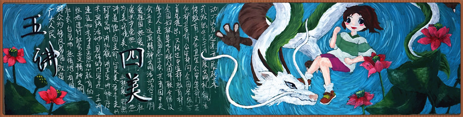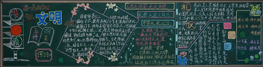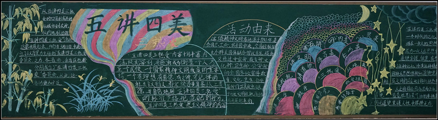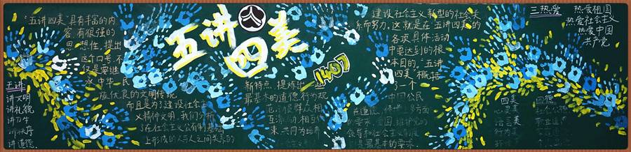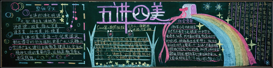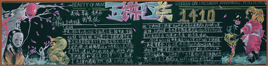 为弘扬师梅精神,做一个优秀的师梅学子。本月学校举行了一次以“五讲四美”为主题的黑板报比赛,宣扬“五讲”(讲文明,讲礼貌,讲卫生,讲秩序,讲道德)的行为准则,发扬“四美”(心灵美、行为美、语言美、环境美)的文明精神。