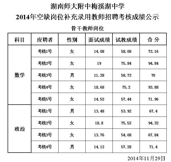 2014年空缺岗位补充录用教师招聘考核成绩公示